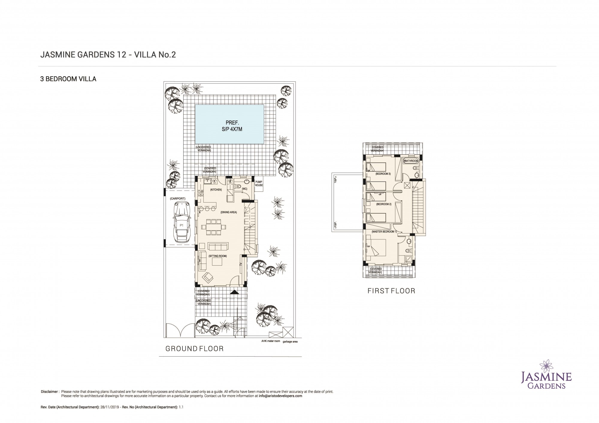 Jasmine Gardens, Villa No. 2 in Phase 12, is a modern residential 3 bedroom villa located in the heart of the city of Paphos, close to the Paphos Harbour, the Tourist area, famous archaeological and historical sites such as the Tombs of the Kings and the Kings Avenue Mall. The villa enjoys a private swimming pool, spacious outdoor spaces, and covered verandas.