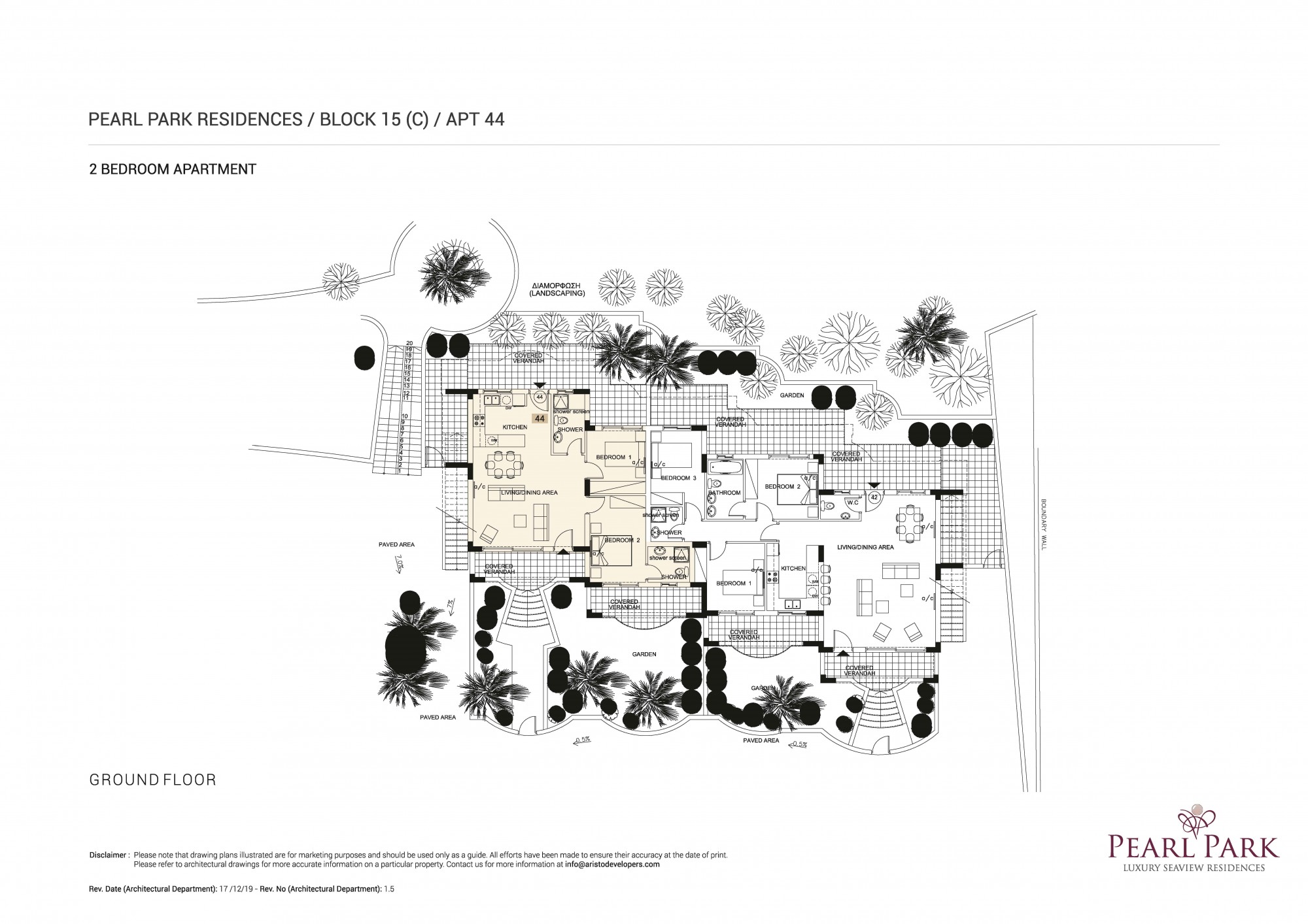 Резиденция № 44, блок C, в комплексе Pearl Park Residences – это великолепные 2-комнатные апартаменты для продажи в Пафосе, Кипр. В комплексе предусмотрены первоклассные удобства, в том числе детский и общий бассейны, свой тренажерный зал, а также чудесные собственные сады. Апартаменты расположены рядом с роскошным зеленым парком и детской игровой площадкой, недалеко от основных объектов города, включая гавань и туристическую зону Пафоса, а также ТЦ Kings Avenue Mall.
